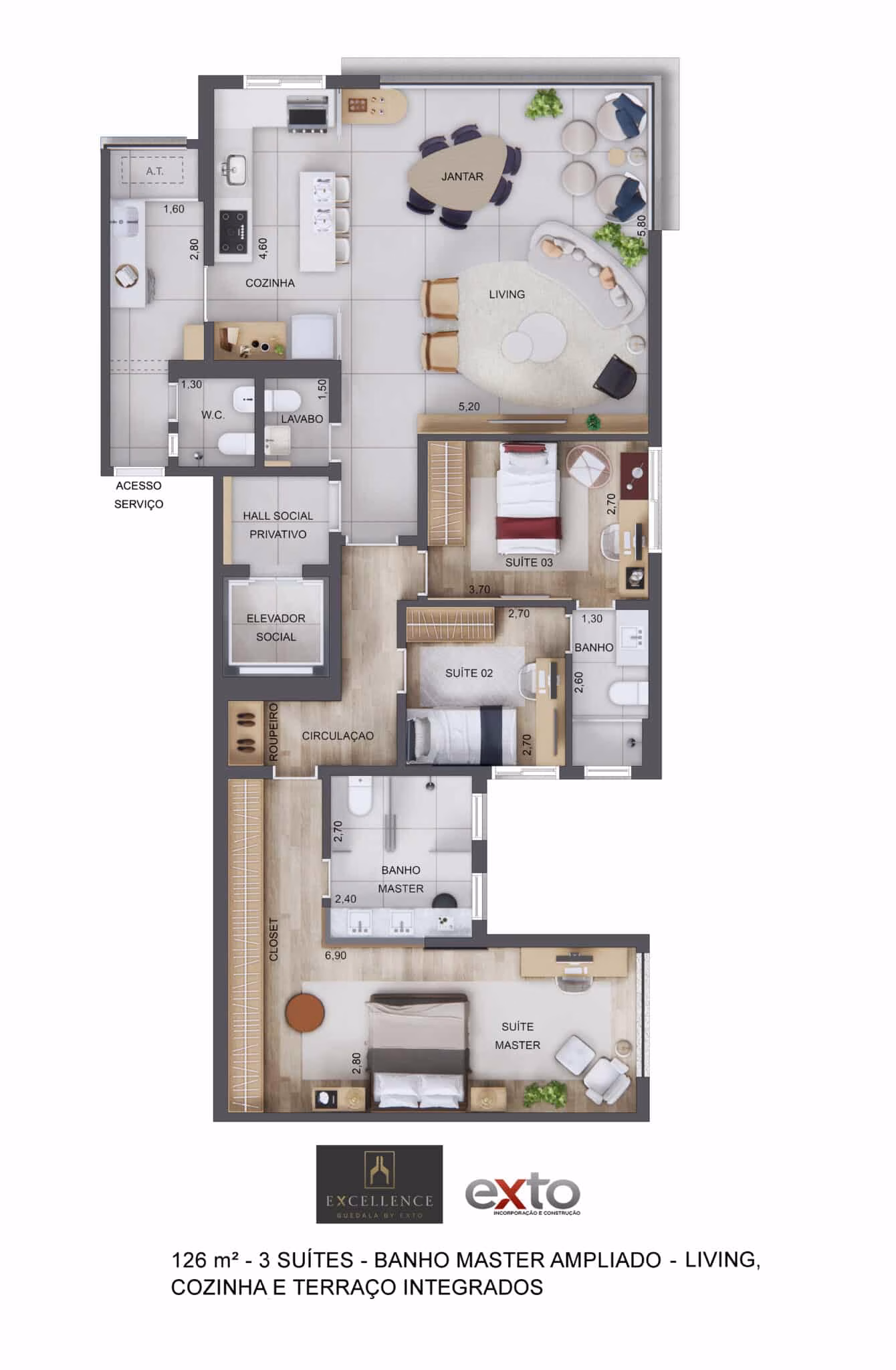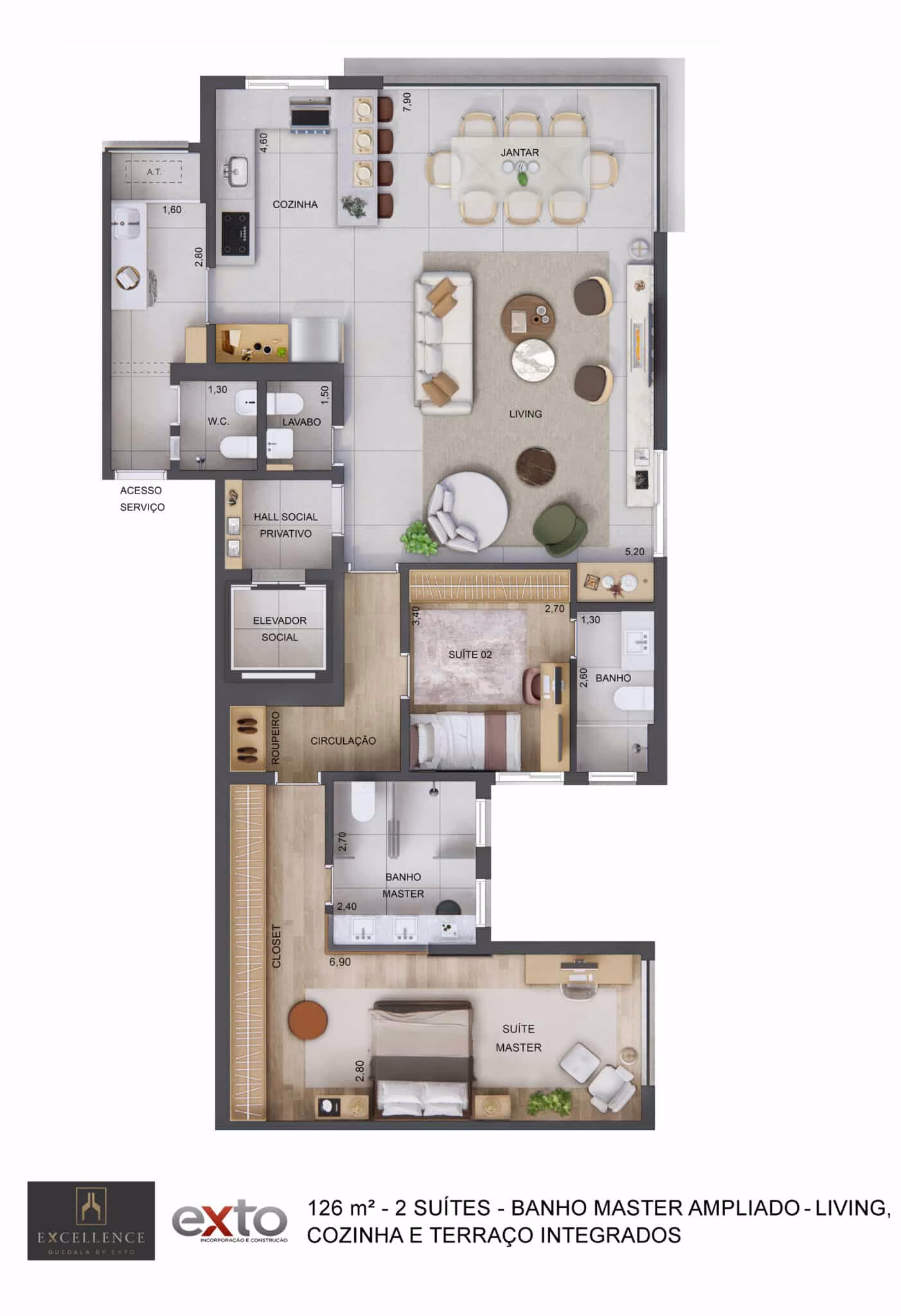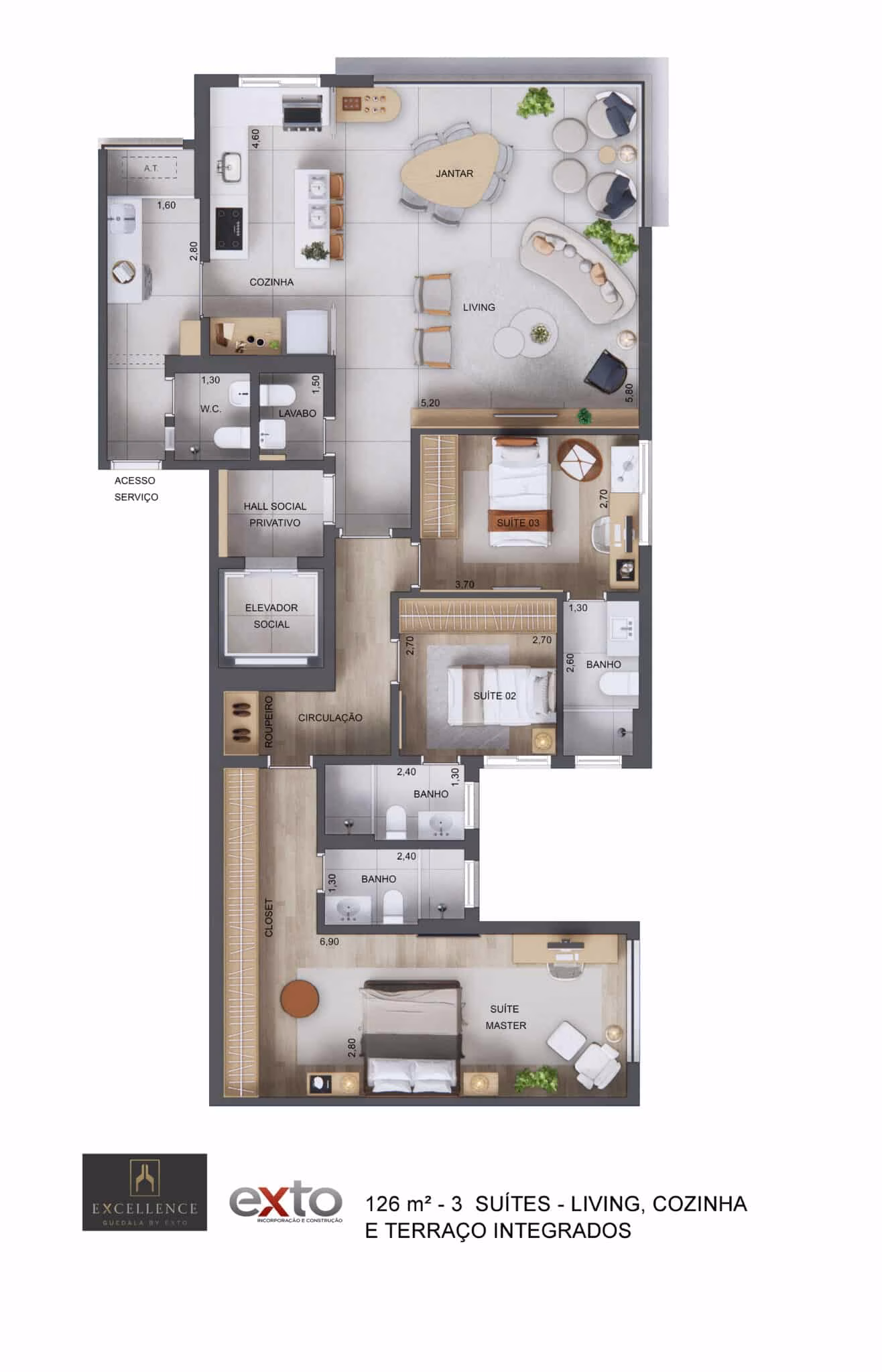 • Planta de 126m²: Perfeita para quem deseja mais espaço e sofisticação, proporcionando ambientes amplos e bem distribuídos.