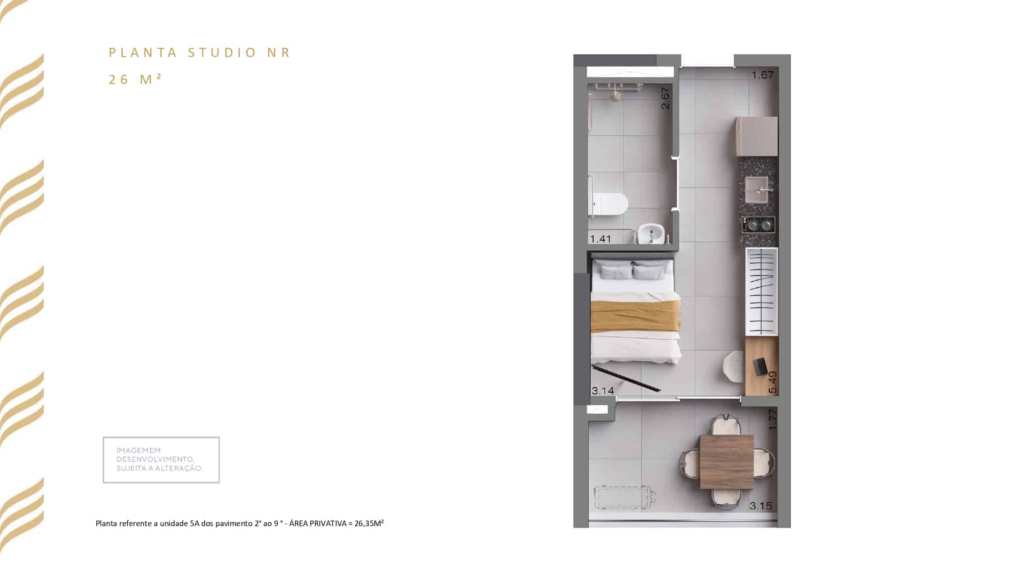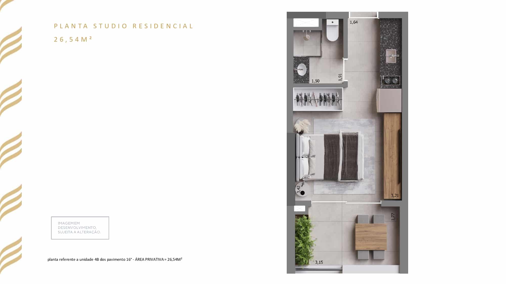 Studios Residenciais e Não Residenciais (26 m²): Espaços planejados para atender às demandas de quem busca praticidade e modernidade, ideais para moradia ou para investimentos.