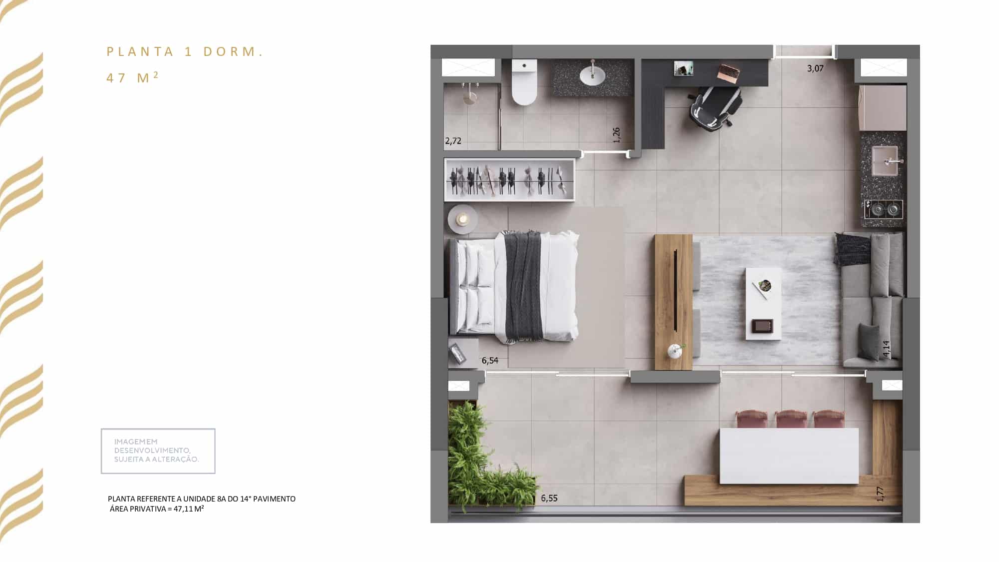 Apartamentos de 1 Dormitório (47 m²): Elegância e funcionalidade se encontram nesses espaços cuidadosamente projetados, oferecendo um refúgio privado para o conforto do seu lar.